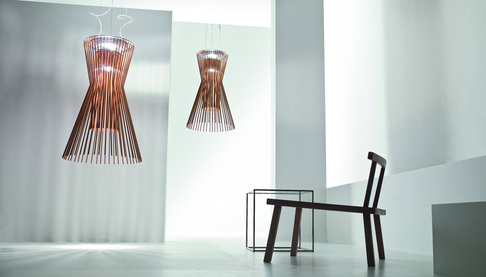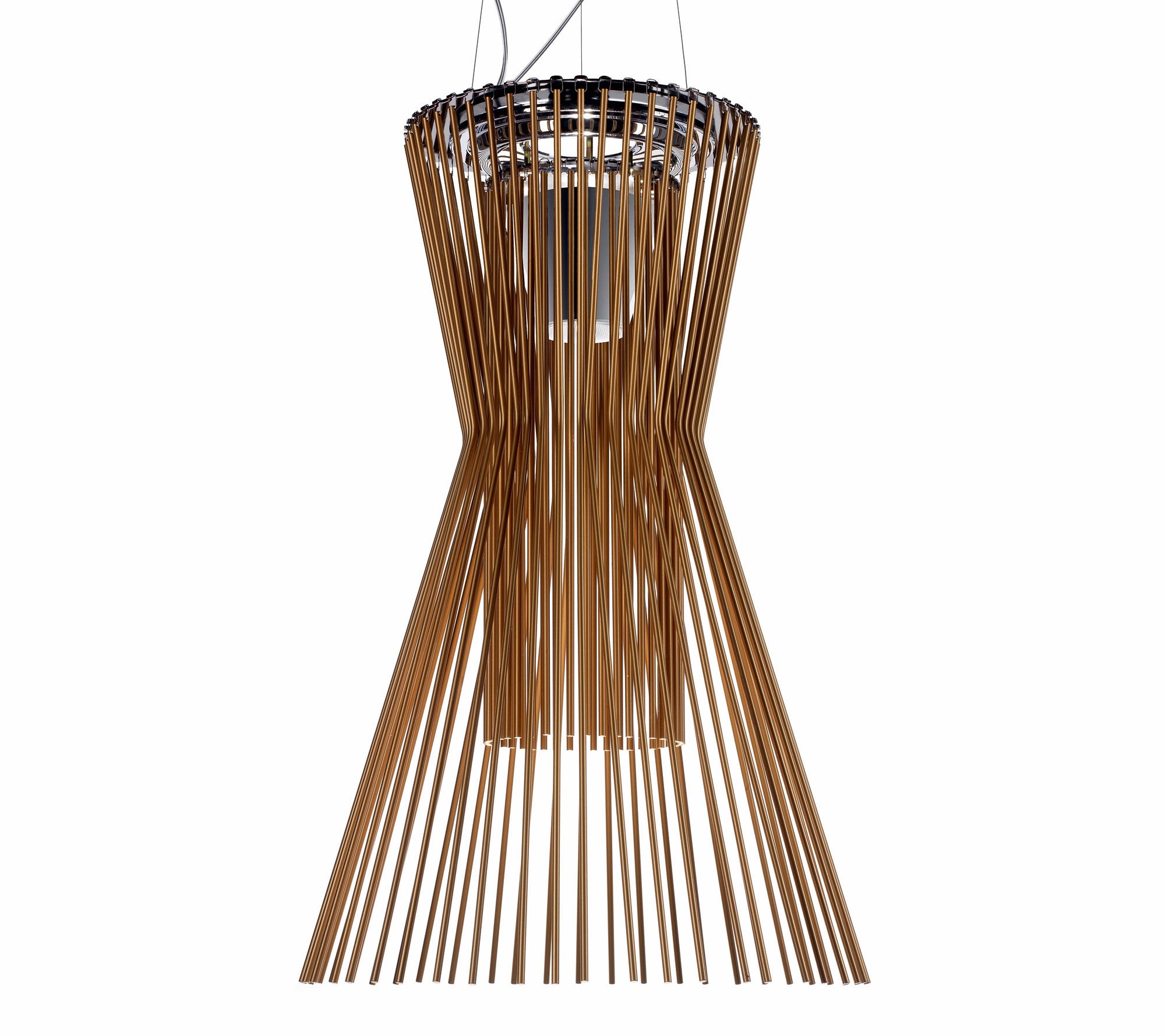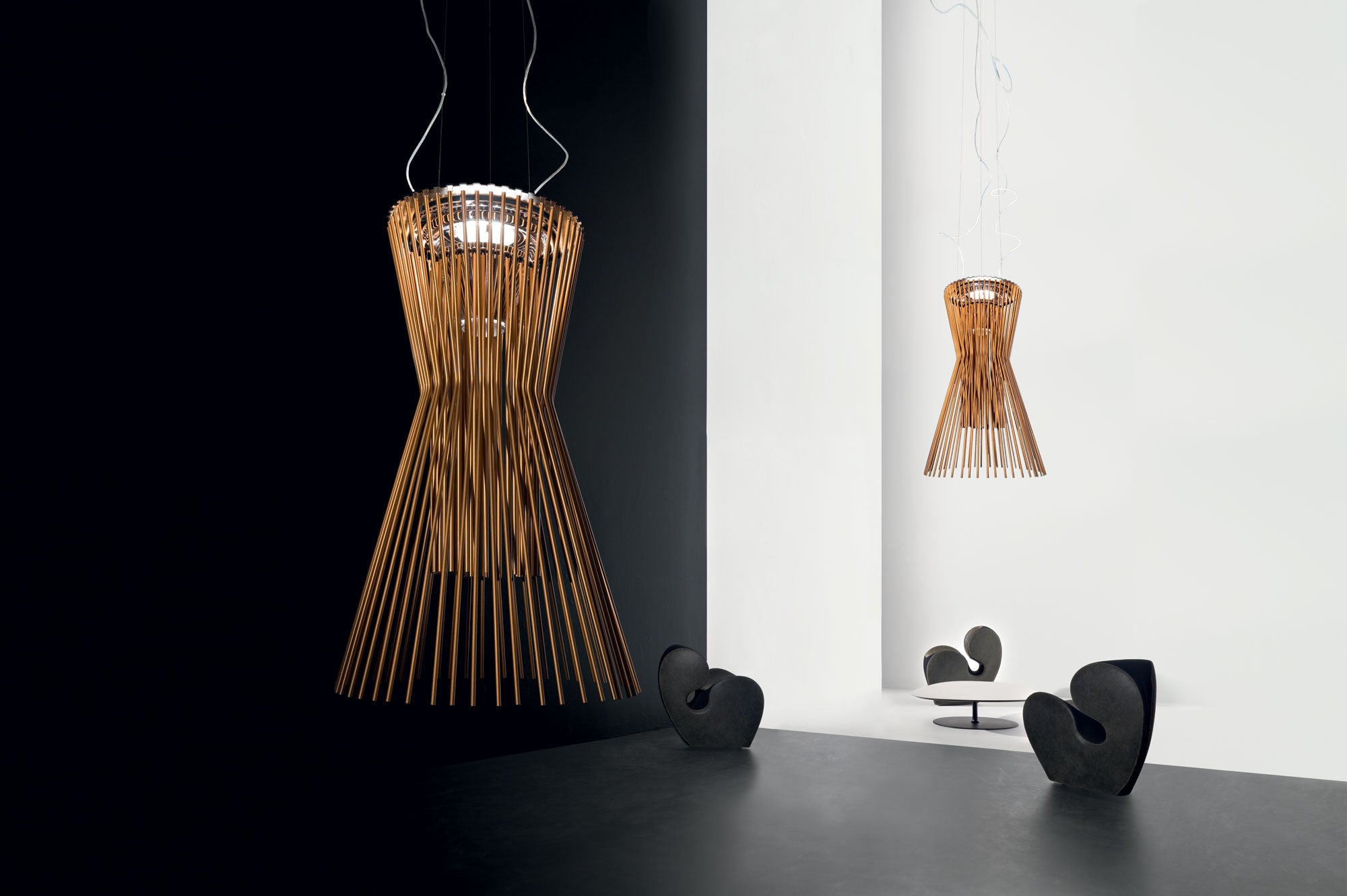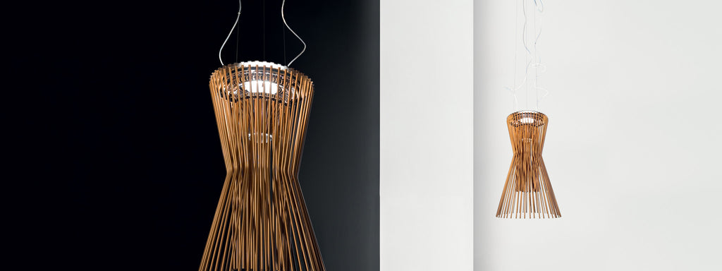 Lignes situées l’une à côté de l’autre qui, dans un équilibre presque magique, suspendu, créent une symphonie fascinante et raffinée, en donnant naissance à une lampe destinée à caractériser des pièces aux dimensions importantes, publiques comme privées. Possibilité double allumage.